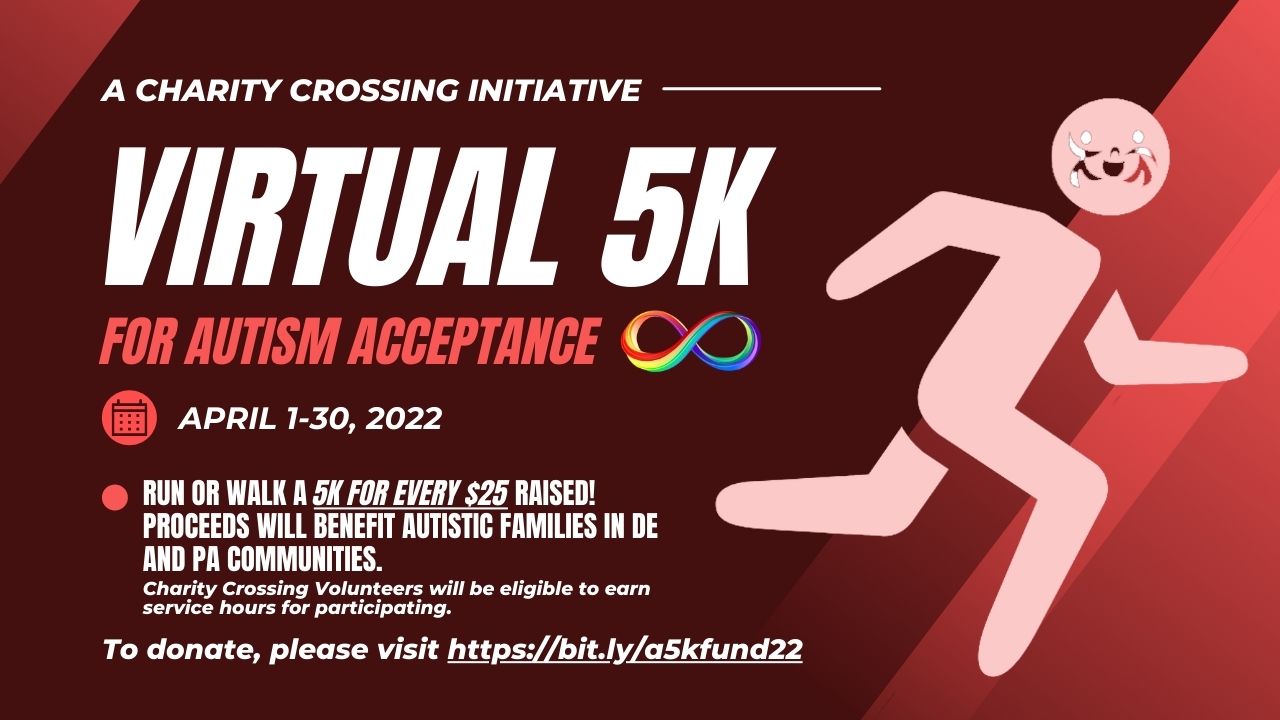 On April 23rd, Charity Crossing will be hosting its’ 5th annual Autism understanding and acceptance walk at Glasgow Park, Delaware, and Wilson Farm Park, Pennsylvania. It is free to participate. Please join us to show your support to Autistic communities.